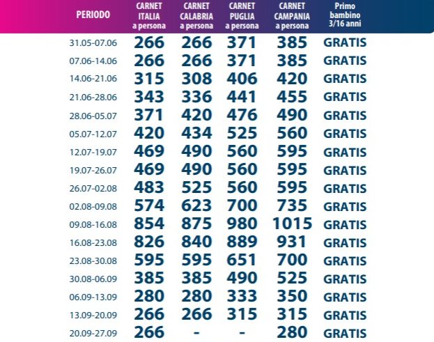 Riduzioni: 4° letto 2/12 anni 50%, 3° e 4° letto adulto 30%.