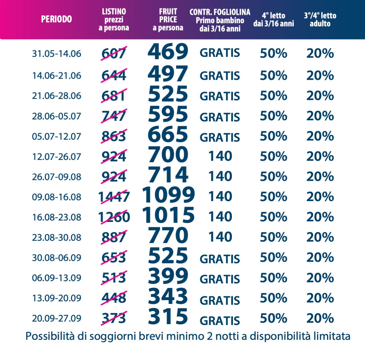 FRUIT TRAVEL CARD adulti €60 per persona, bambini 2/12 anni €30 per persona (obbligatoria e parte integrante del costo del pacchetto di viaggio, include: modifica prenotazione, annullamento per motivi gravi, assistenza)
