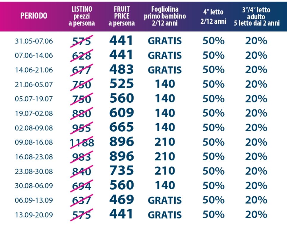 Una vacanza in Sicilia pensata per tutta la famiglia, tra mare cristallino, relax e divertimento. Il Fruit Village Patti Beach Resort accoglie gli ospiti con formula pensione completa con bevande, animazione Fruit Village, spiaggia attrezzata e servizi ideali per adulti e bambini. Un soggiorno perfetto per chi desidera vivere il meglio della Sicilia in totale comfort, con offerte dedicate alle famiglie e periodi vantaggiosi per l’estate 2026