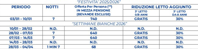 Include cocktail di benvenuto, intrattenimento diurno e serale con cabaret e piano bar, miniclub 2/12 anni (infant di 2 anni ammessi solo se indipendenti dal pannolino) con orario continuato dalle 8.30 alle 21.00 (sabato non è attivo), club non sciatori, ingresso alla piscina e al Centro Benessere a discrezione della direzione (bambini 2/16 anni ammessi solo in piscina se accompagnati da adulti e negli orari dedicati), servizio navetta da/per gli impianti.