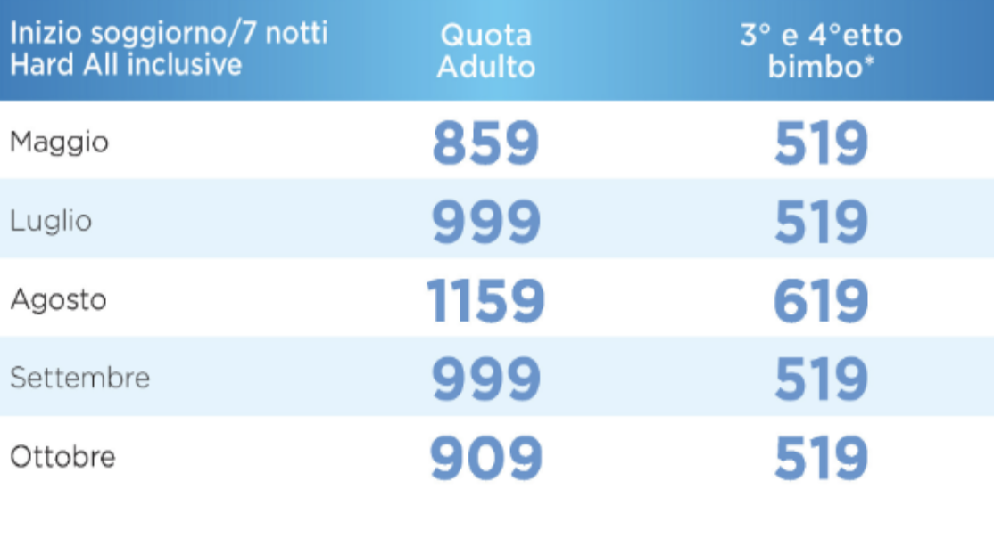 asciugacapelli. Si dividono in Classic per 2/4 persone (occupazione massima 2 adulti + 2 bambini 2/16 anni), alcune con vista mare laterale con supplemento, ampie e luminose, tutte con terrazzino attrezzato; Family Vista Monte per 4/5 persone (occupazione massima 4 adulti + 1 bambino 2/16 anni), composte da 2 camere da letto doppie, cabina armadio e tv, terrazzo attrezzato. Appartamenti Standard per 3/4 persone (occupazione massima 2 adulti + 2 bambini 2/16 anni) e Appartamenti Standard doppia camera per 4/5 persone (occupazione massima 4 adulti + 1 bambino 2/16 anni), recentemente rinnovati, situati all’entrata del villaggio e raggiungibili tramite dei gradini. Possibilità di camere per diversamente abili.